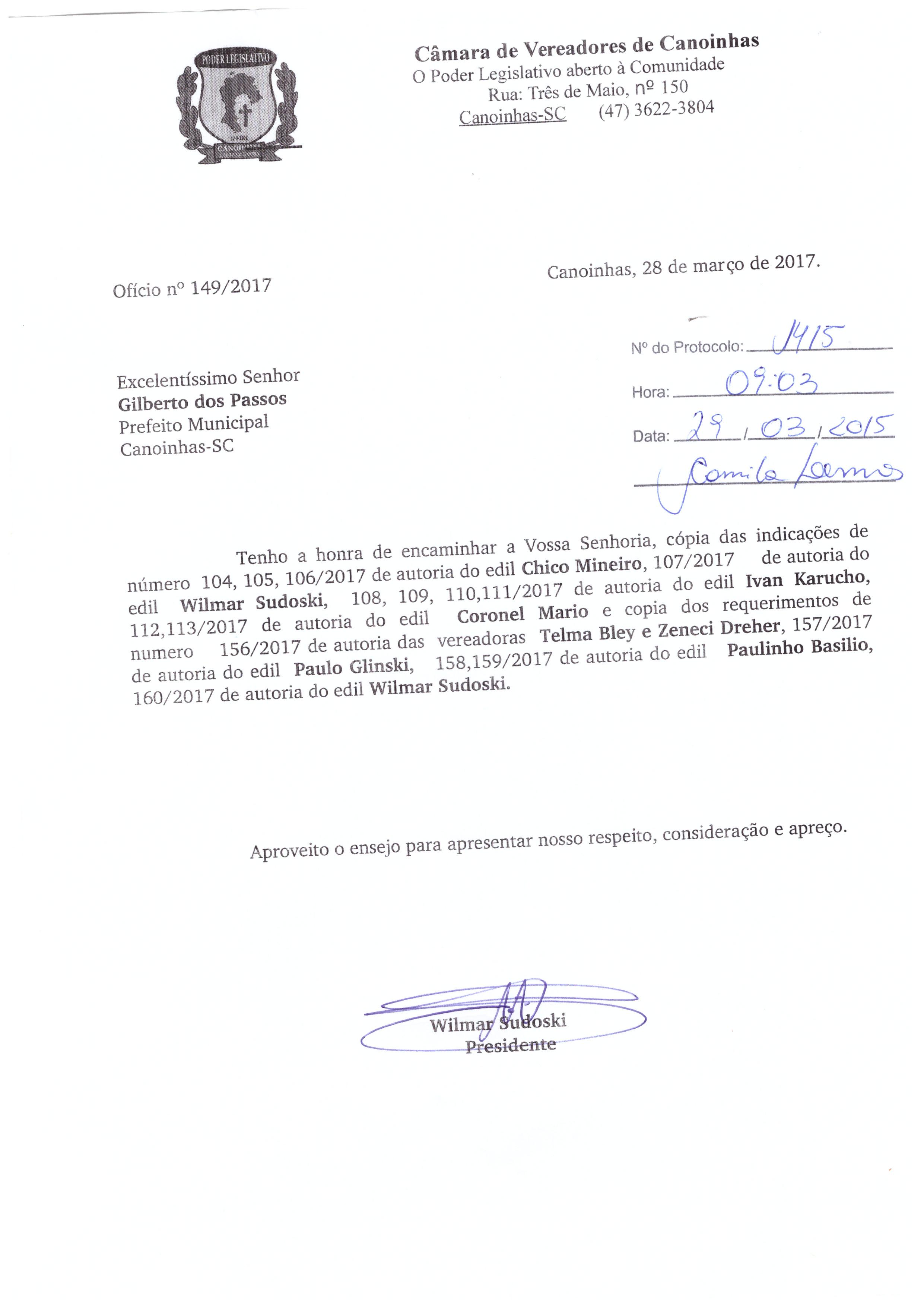 Ofício - 149/2017 de 28/03/2017 por PRESIDENTE (Indicação nº 106 de 2017)