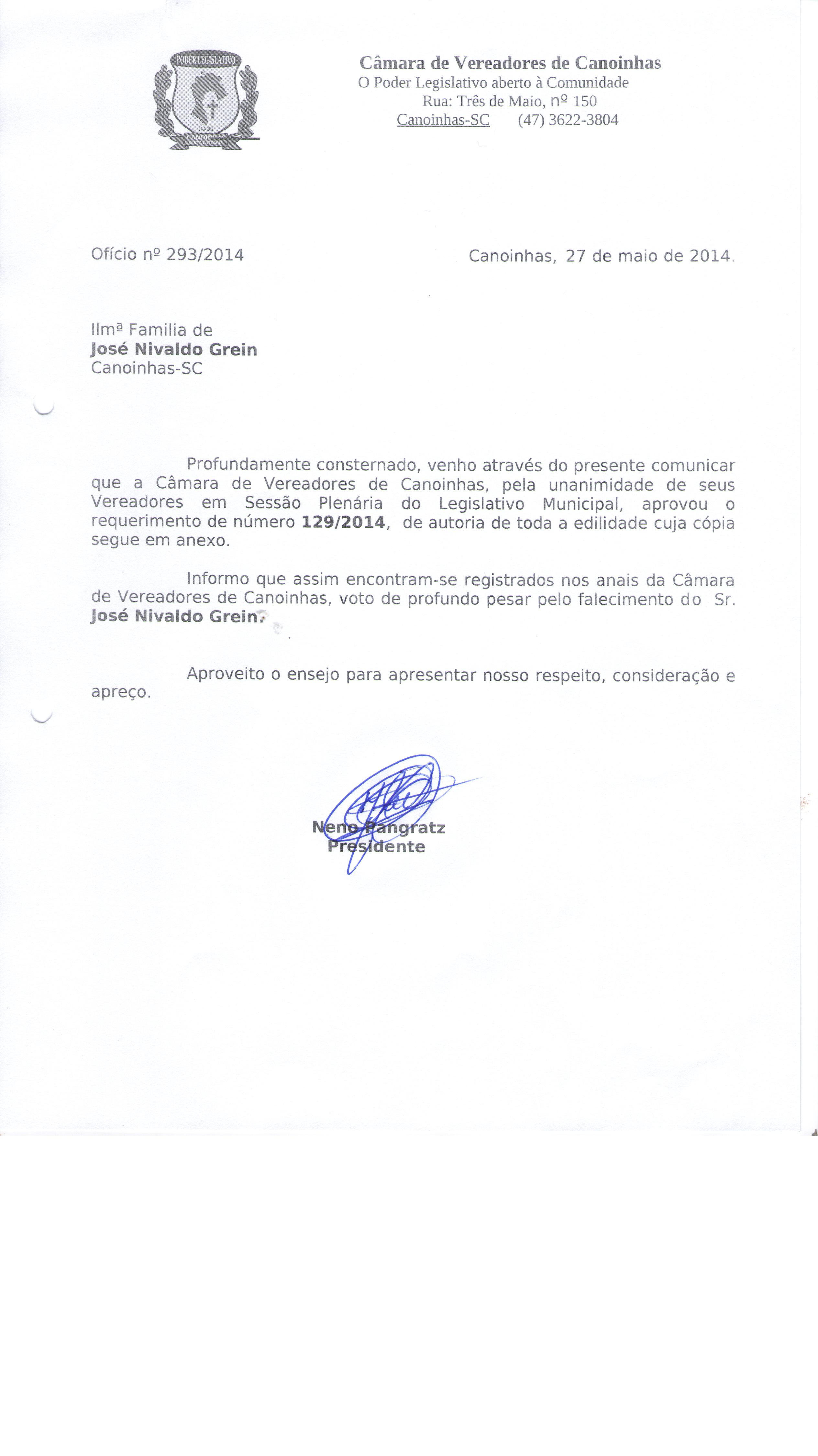 Ofício - Ofício nº 293/2014 de 27/05/2014 por Presidente (Requerimento nº 129 de 2014)