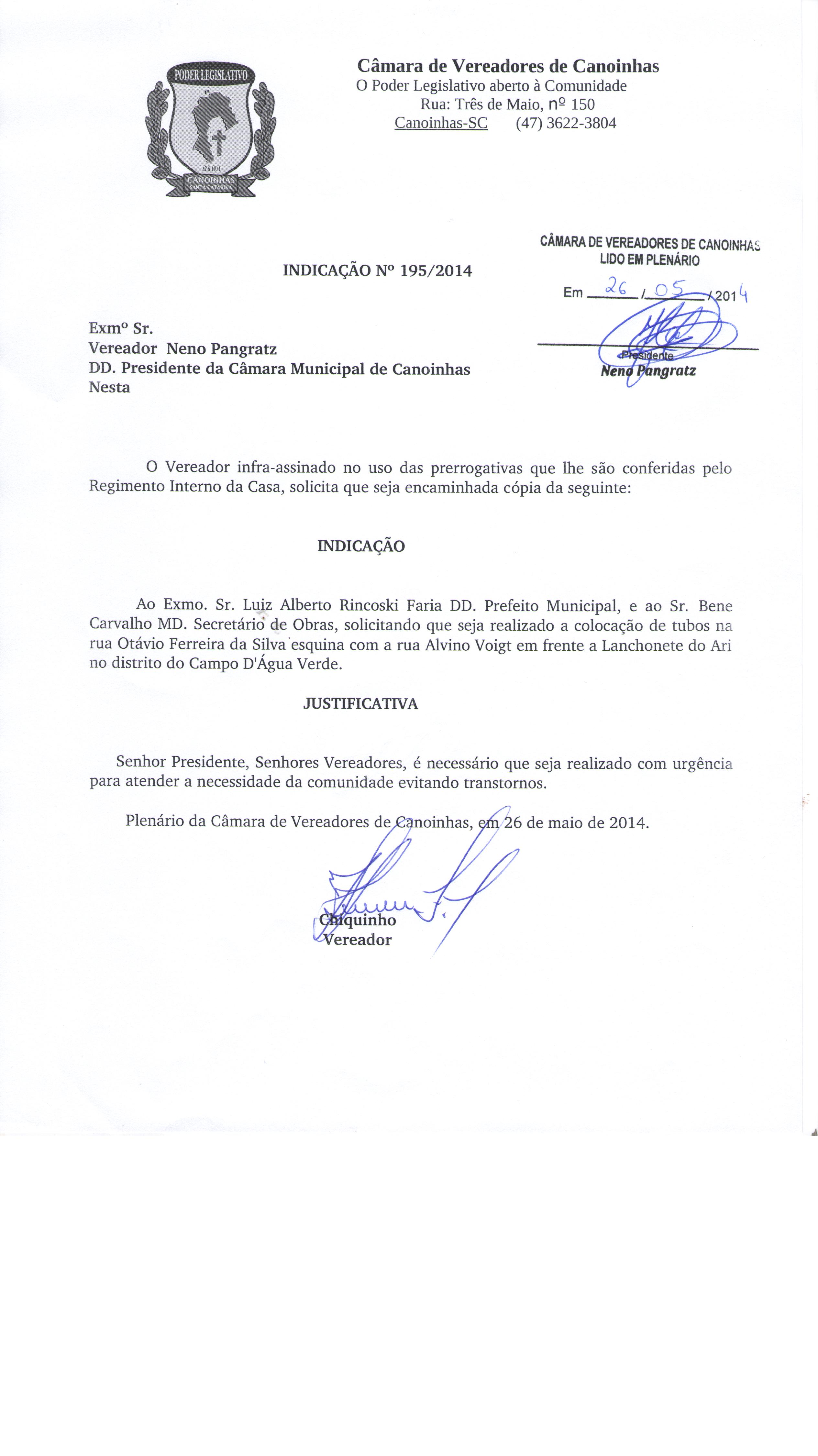 Ementa: INDICAÇÃO Nº 195/2014, DE AUTORIA DO EDIL CHIQUINHO DA SILVA, AO EXMO. SR. LUIZ ALBERTO RINCOSKI FARIA DD. PREFEITO MUNICIPAL, E AO SR. BENE DE CARVALHO MD. SECRETÁRIO DE OBRAS, SOLICITANDO QUE SEJA REALIZADO A COLOCAÇÃO DE TUBOS NA RUA OTÁVIO FERREIRA DA SILVA ESQUINA COM A RUA ALVINO VOIGT EM FRENTE A LACHONETE DO ARI NO DISTRITO DO CAMPO D'ÁGUA VERDE.