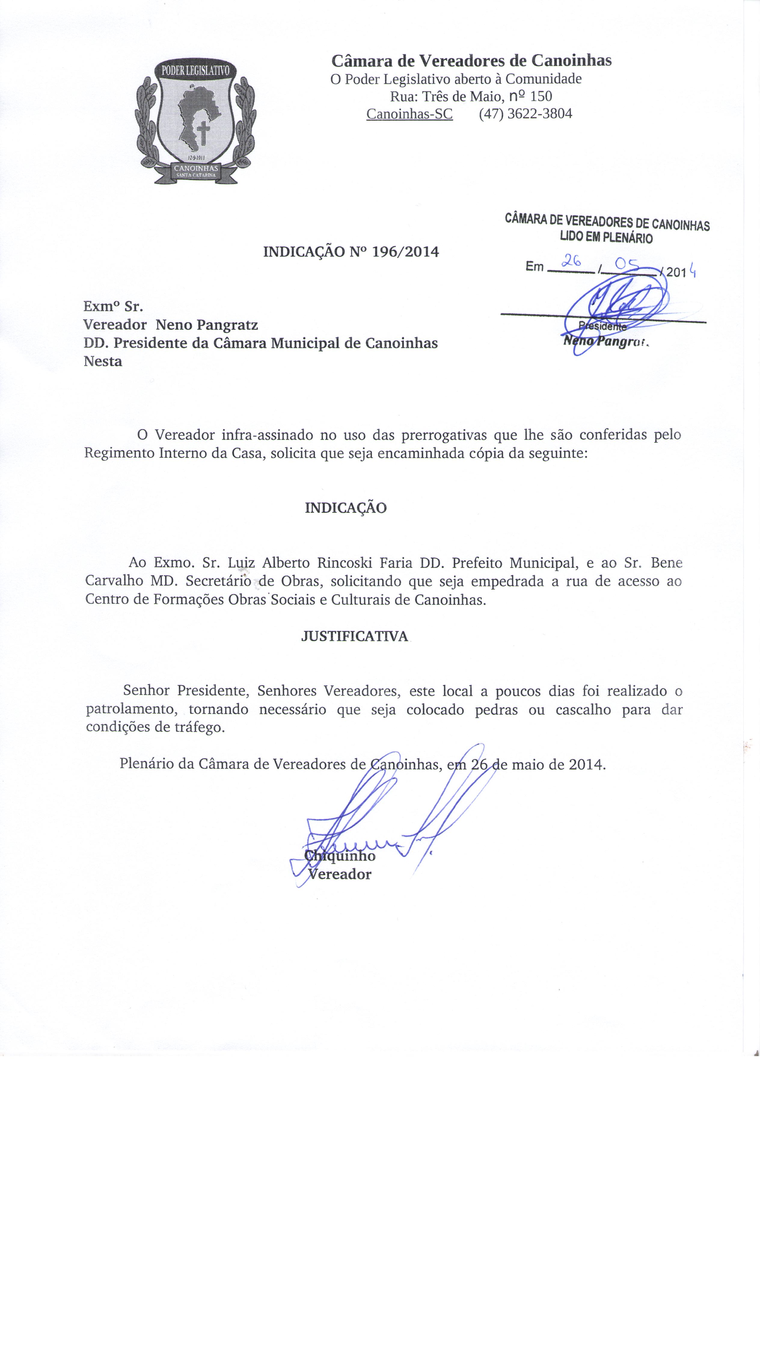 Ementa: INDICAÇÃO Nº 196/2014, DE AUTORIA DO EDIL CHIQUINHO DA SILVA, AO EXMO. SR. LUIZ ALBERTO RINCOSKI FARIA DD. PREFEITO MUNICIPAL, E AO SR. BENE CARVALHO MD. SECRETÁRIO DE OBRAS, SOLICITANDO QUE SEJA EMPEDRADA A RUA DE ACESSO AO CENTRO DE FORMAÇÕES OBRAS SOCIAIS E CULTURAIS DE CANOINHAS.