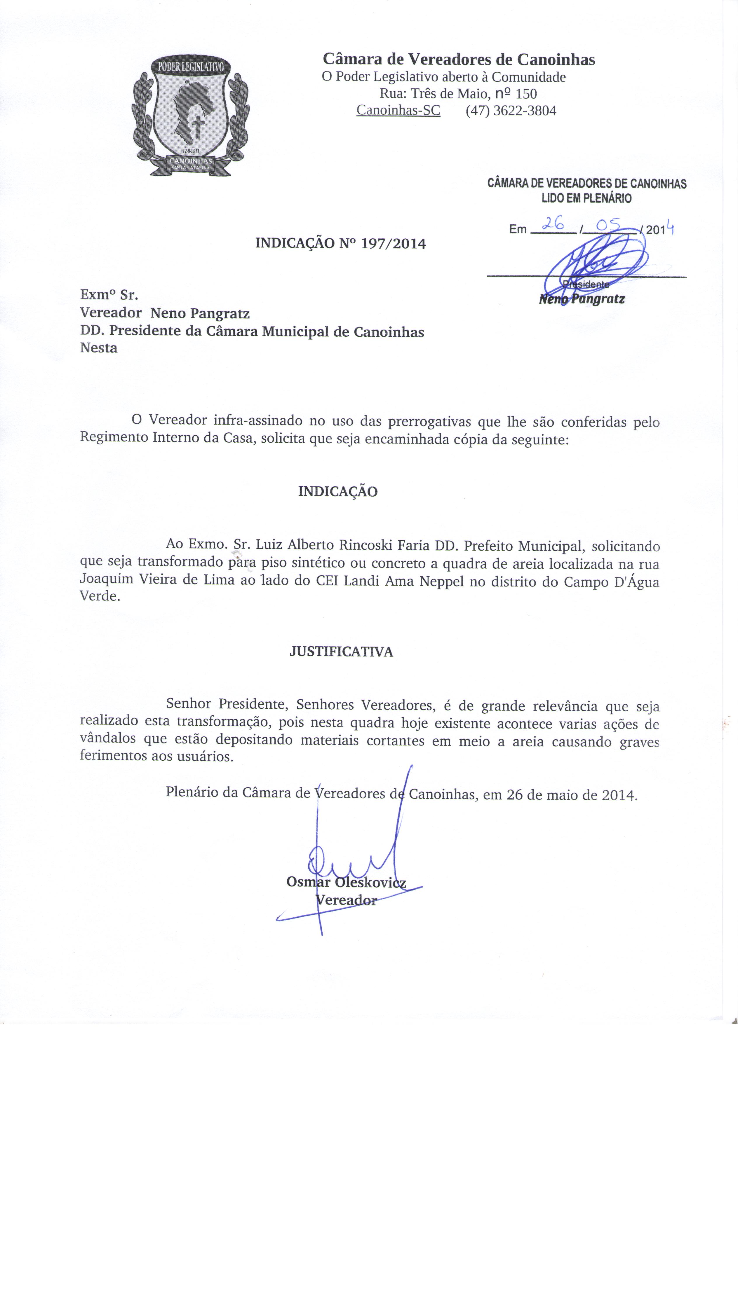Ementa: INDICAÇÃO Nº 197/2014, DE AUTORIA DO EDIL OSMAR OLESKOVICZ, AO EXMO. SR. LUIZ ALBERTO RINCOSKI FARIA DD. PREFEITO MUNICIPAL, SOLICITANDO QUE SEJA TRANSFORMADO PARA PISO SINTÉTICO OU CONCRETO A QUADRA DE AREIA LOCALIZADA NA RUA JOAQUIM VIEIRA DE LIMA AO LADO DO CEI LANDI AMA NEPPEL NO DISTRITO DO CAMPO D'ÁGUA VERDE.