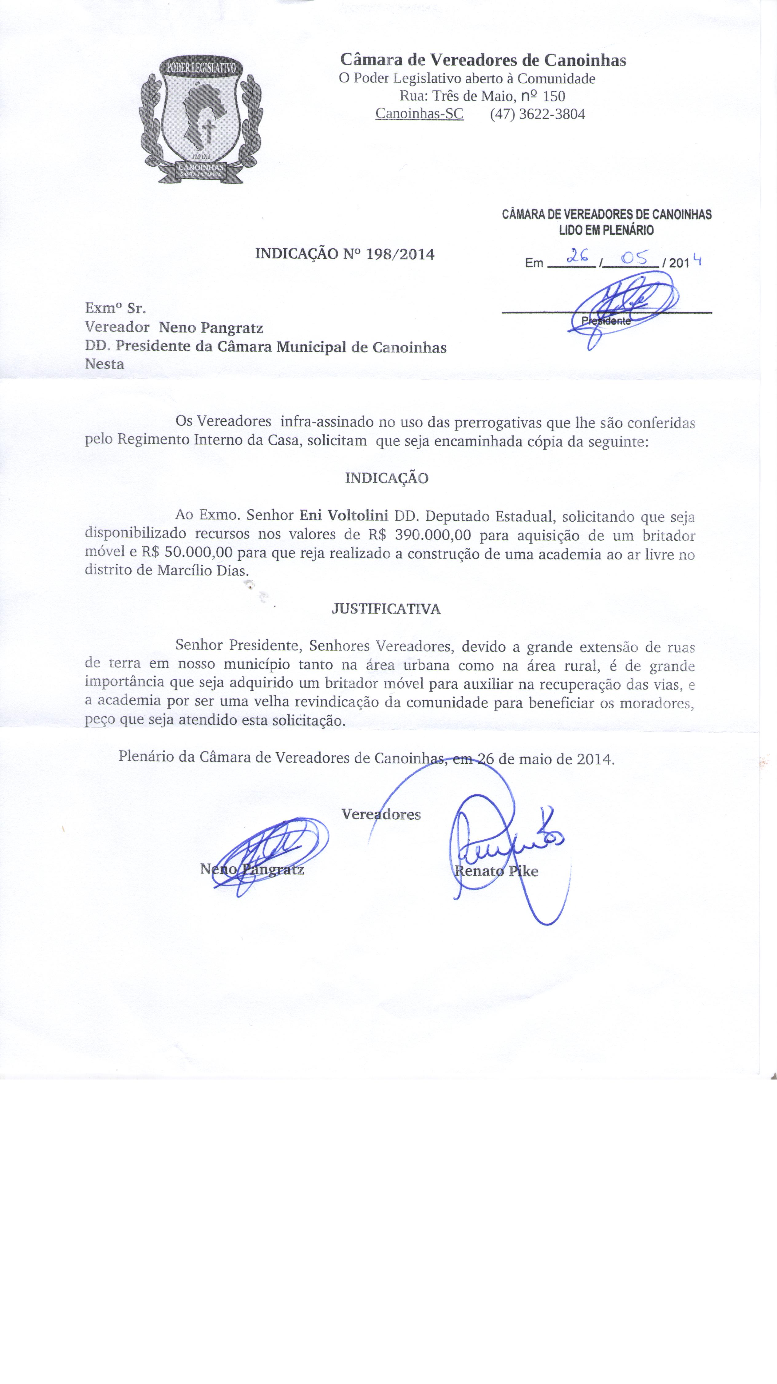 Ementa: INDICAÇÃO Nº 198/2014, DE AUTORIA DO EDIL NENO PANGRATZ, AO EXMO. SENHOR ENI VOLTOLINI DD. DEPUTADO ESTADUAL, SOLICITANDO QUE SEJA DISPONIBILIZADO RECURSOS NOS VALORES DE R$ 390.000,00 PARA AQUISIÇÃO DE UM BRITADOR MÓVEL E R$ 50.000,00 PARA QUE REJA REALIZADO A CONSTRUÇÃO DE UMA ACADEMIA AO AR LIVRE NO DISTRITO DE MARCÍLIO DIAS.