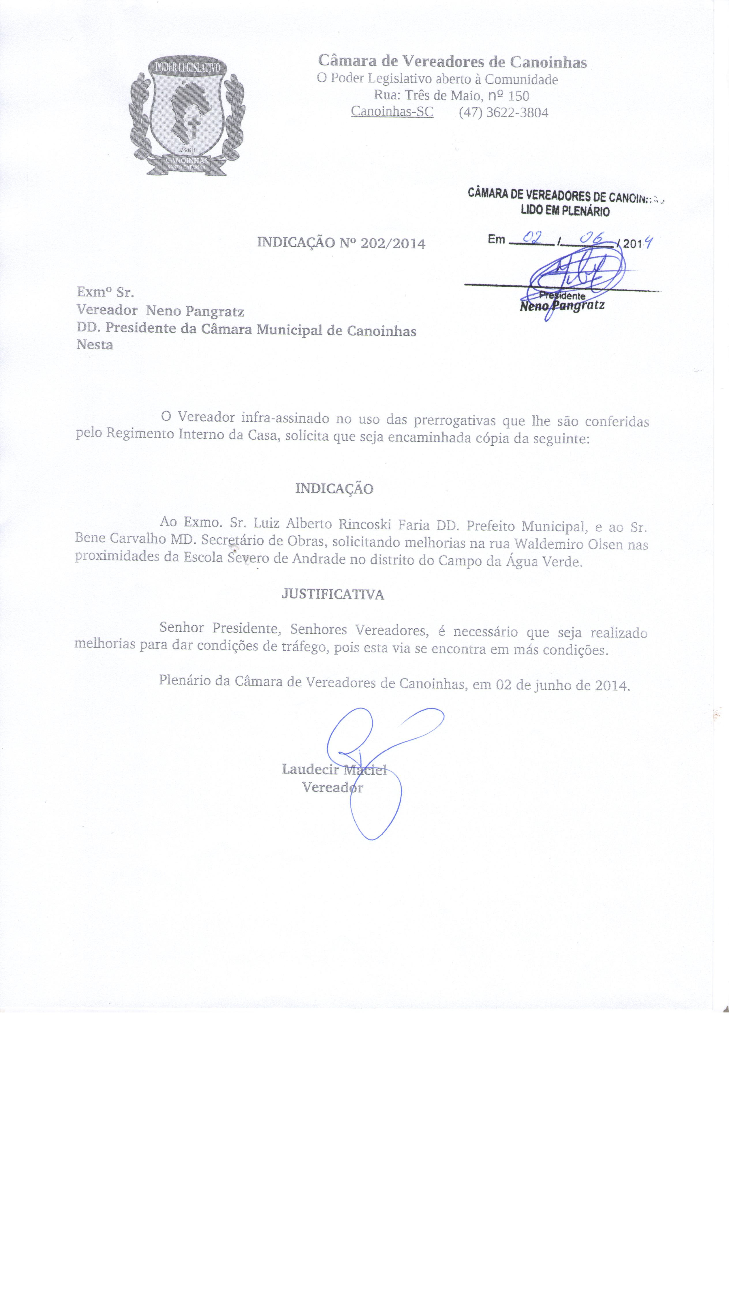 Ementa: INDICAÇÃO Nº 202/2014, DE AUTORIA DO EDIL LAUDECIR MACIEL, AO EXMO. SR. LUIZ ALBERTO RINCOSKI FARIA DD. PREFEITO MUNICIPAL, E AO SR. BENE CARVALHO MD. SECRETÁRIO DE OBRAS, SOLICITANDO MELHORIAS NA RUA WALDEMIRO OLSEN NAS PROXIMIDADES DA ESCOLA SEVERO DE ANDRADE NO DISTRITO DO CAMPO DA ÁGUA VERDE.