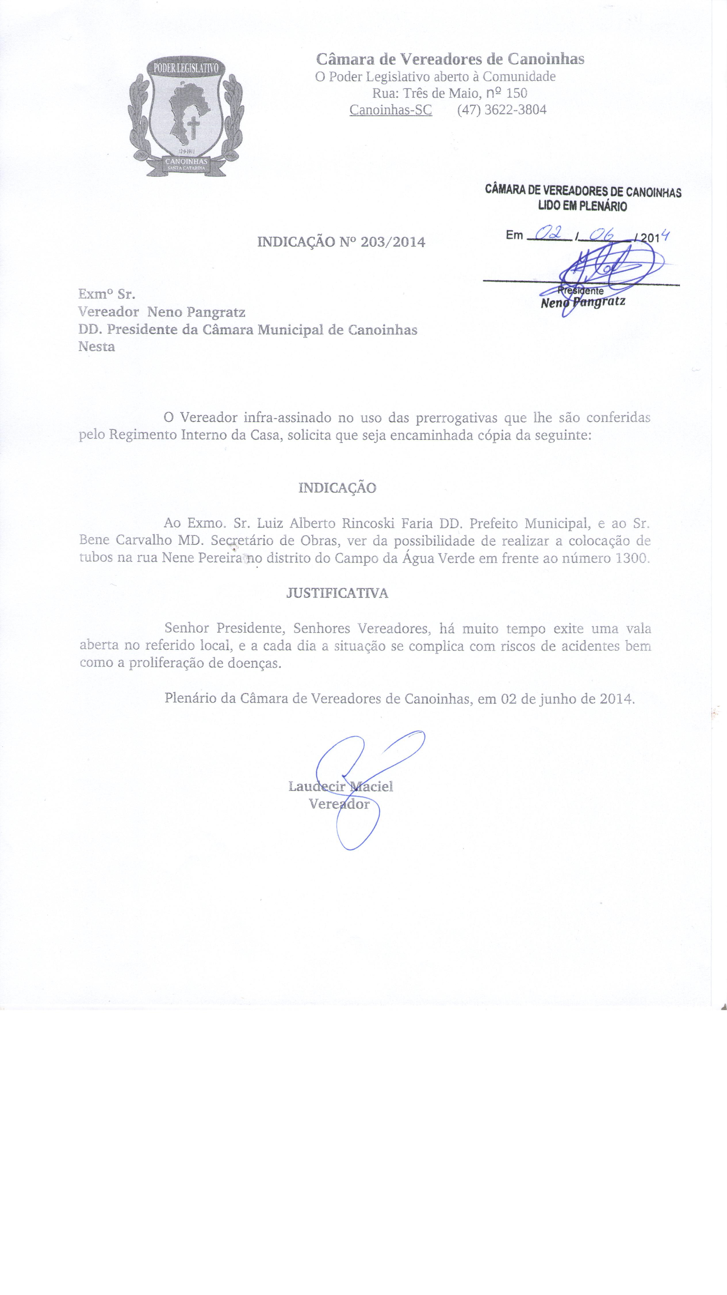 Ementa: INDICAÇÃO Nº 203/2014, DE AUTORIA DO EDIL LAUDECIR MACIEL, AO EXMO. SR. LUIZ ALBERTO RINCOSKI FARIA DD. PREFEITO MUNICIPAL, E AO SR. BENE CARVALHO MD. SECRETÁRIO DE OBRAS, VER DA POSSIBILIDADE DE REALIZAR A COLOCAÇÃO DE TUBOS NA RUA NENE PEREIRA NO DISTRITO DO CAMPO DA ÁGUA VERDE EM FRENTE AO NÚMERO 1300.