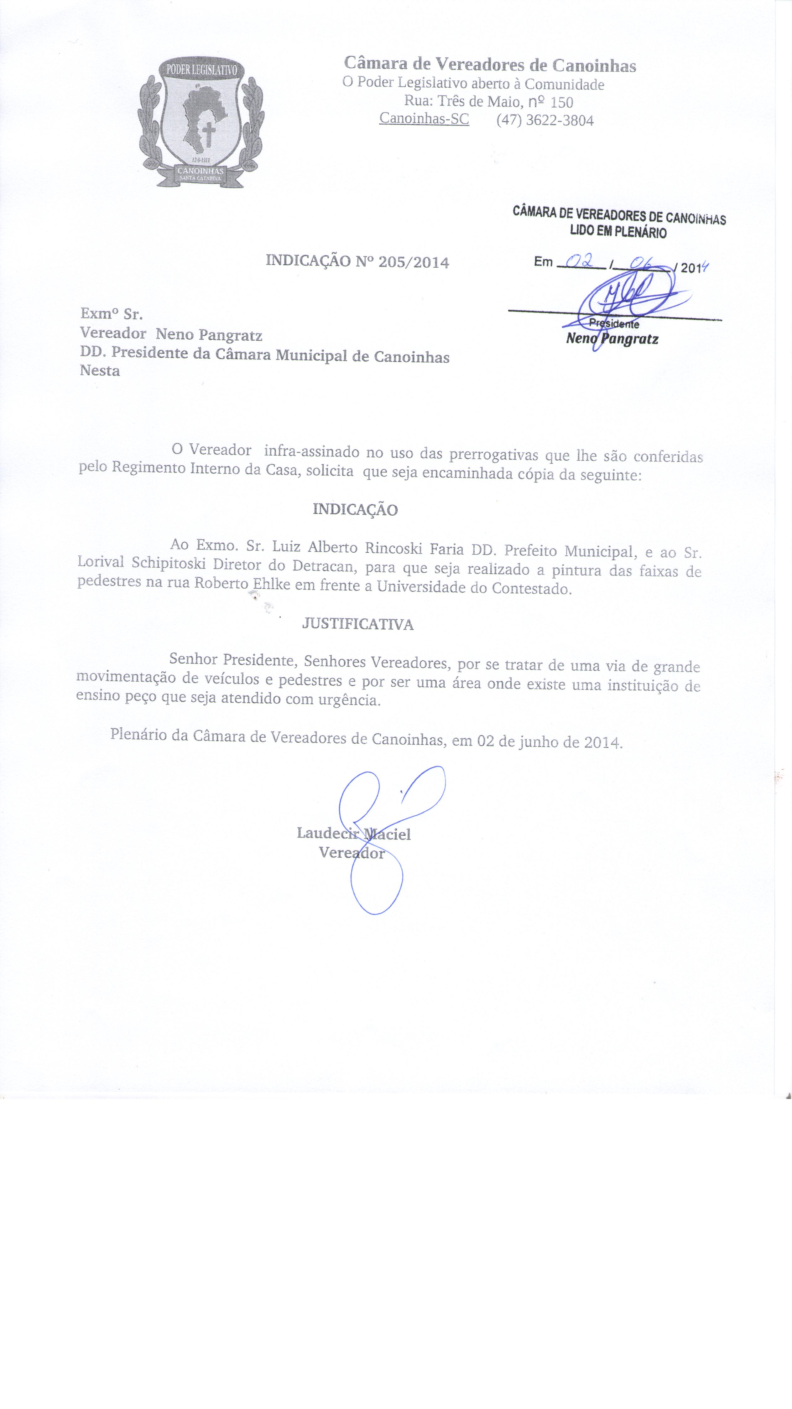 Ementa: INDICAÇÃO Nº 205/2014, DE AUTORIA DO EDIL LAUDECIR MACIEL, AO EXMO. SR. LUIZ ALBERTO RINCOSKI FARIA DD. PREFEITO MUNICIPAL, E AO SR. LORIVAL SCHIPITOSKI DIRETOR DO DETRACAN, PARA QUE SEJA REALIZADO A PINTURA DAS FAIXAS DE PEDESTRES NA RUA ROBERTO EHLKE EM FRENTE A UNIVERSIDADE DO CONTESTADO.