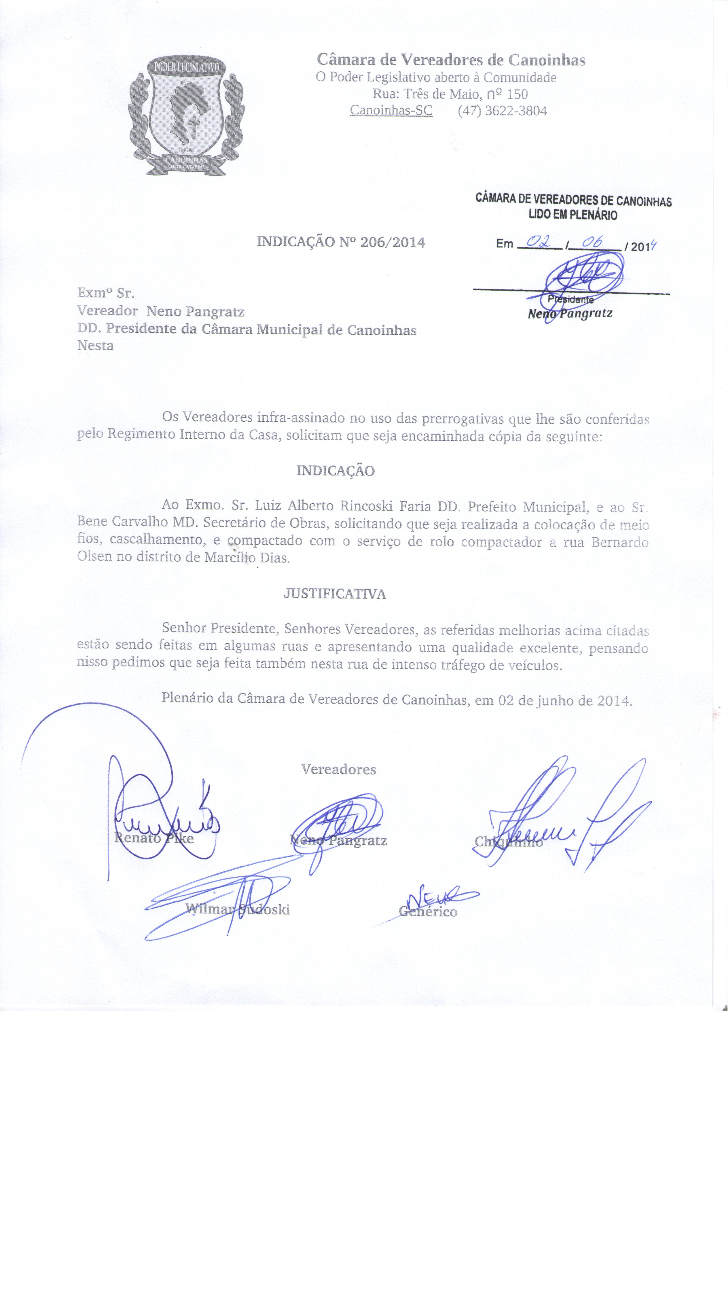 Ementa: INDICAÇÃO Nº 206/2014, DE AUTORIA DO EDIL RENATO PIKE, AO EXMO. SR. LUIZ ALBERTO RINCOSKI FARIA DD. PREFEITO MUNICIPAL, E AO SR. BENE CARVALHO MD. SECRETÁRIO DE OBRAS, SOLICITANDO QUE SEJA REALIZADA A COLOCAÇÃO DE MEIO FIOS, CASCALHAMENTO, E COMPACTADO COM O SERVIÇO DE ROLO COMPACTADOR A RUA BERNARDO OLSEN NO DISTRITO DE MARCÍLIO DIAS.