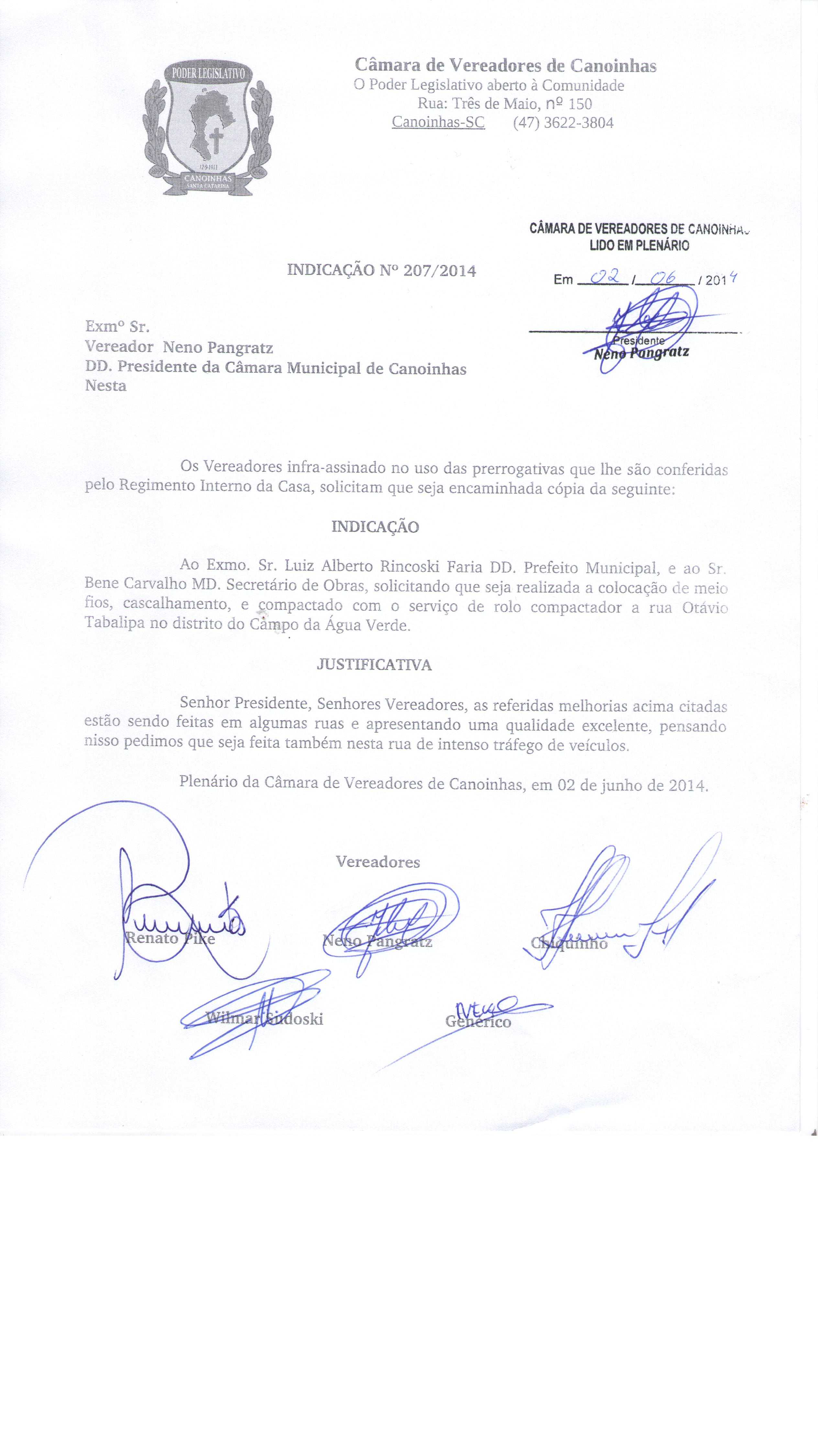 Ementa: INDICAÇÃO Nº 207/2014, DE AUTORIA DO EDIL RENATO PIKE, AO EXMO. SR. LUIZ ALBERTO RINCOSKI FARIA DD. PREFEITO MUNICIPAL, E AO SR. BENE CARVALHO MD. SECRETÁRIO DE OBRAS, SOLICITANDO QUE SEJA REALIZADA A COLOCAÇÃO DE MEIO FIOS, CASCALHAMENTO, E COMPACTADO COM O SERVIÇO DE ROLO COMPACTADOR A RUA OTÁVIO TABALIPA NO DISTRITO DO CAMPO DA ÁGUA VERDE.