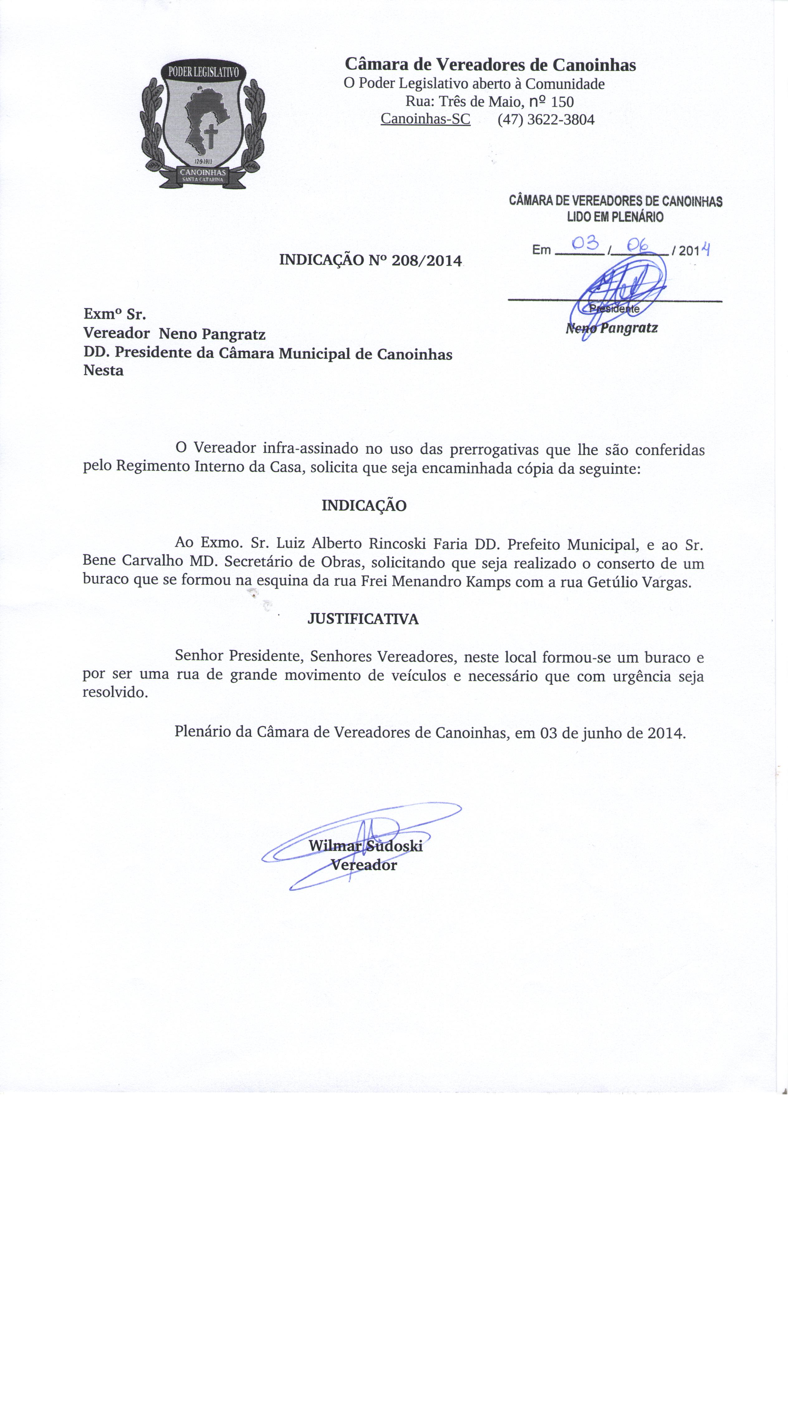 Ementa: INDICAÇÃO Nº 208/2014, DE AUTORIA DO EDIL WILMAR SUDOSKI, AO EXMO. SR. LUIZ ALBERTO RINCOSKI FARIA DD. PREFEITO MUNICIPAL, E AO SR. BENE CARVALHO MD. SECRETÁRIO DE OBRAS, SOLICITANDO QUE SEJA REALIZADO O CONSERTO DE UM BURACO QUE SE FORMOU NA ESQUINA DA RUA FREI MENANDRO KAMPS COM A RUA GETÚLIO VARGAS.