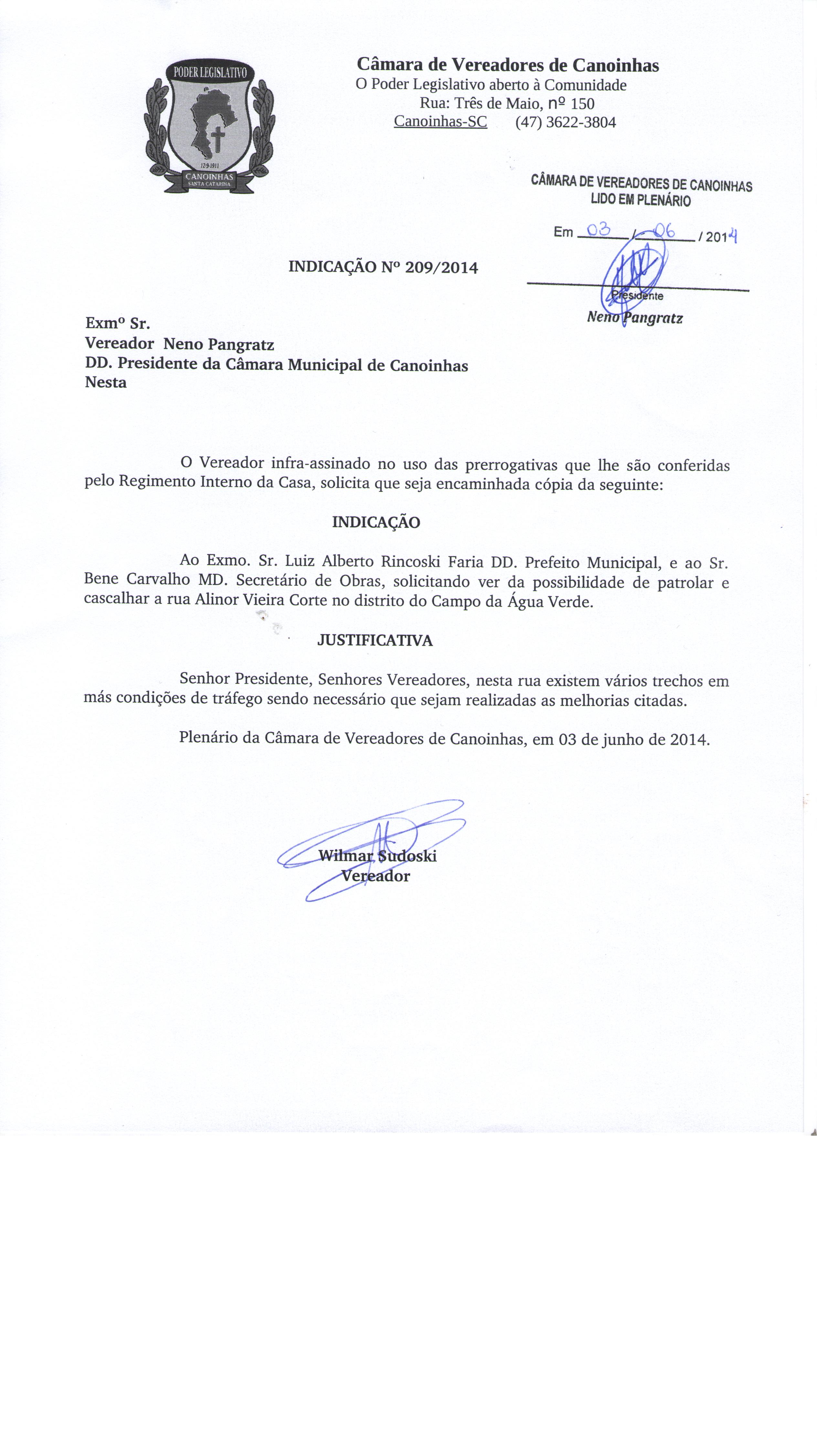 Ementa: INDICAÇÃO Nº 209/2014, DE AUTORIA DO EDIL WILMAR SUDOSKI, AO EXMO. SR. LUIZ ALBERTO RINCOSKI FARIA DD. PREFEITO MUNICIPAL, E AO SR. BENE CARVALHO MD. SECRETÁRIO DE OBRAS, SOLICITANDO VER DA POSSIBILIDADE DE PATROLAR E CASCALHAR A RUA ALINOR VIEIRA CORTE NO DISTRITO DO CAMPO DA ÁGUA VERDE.