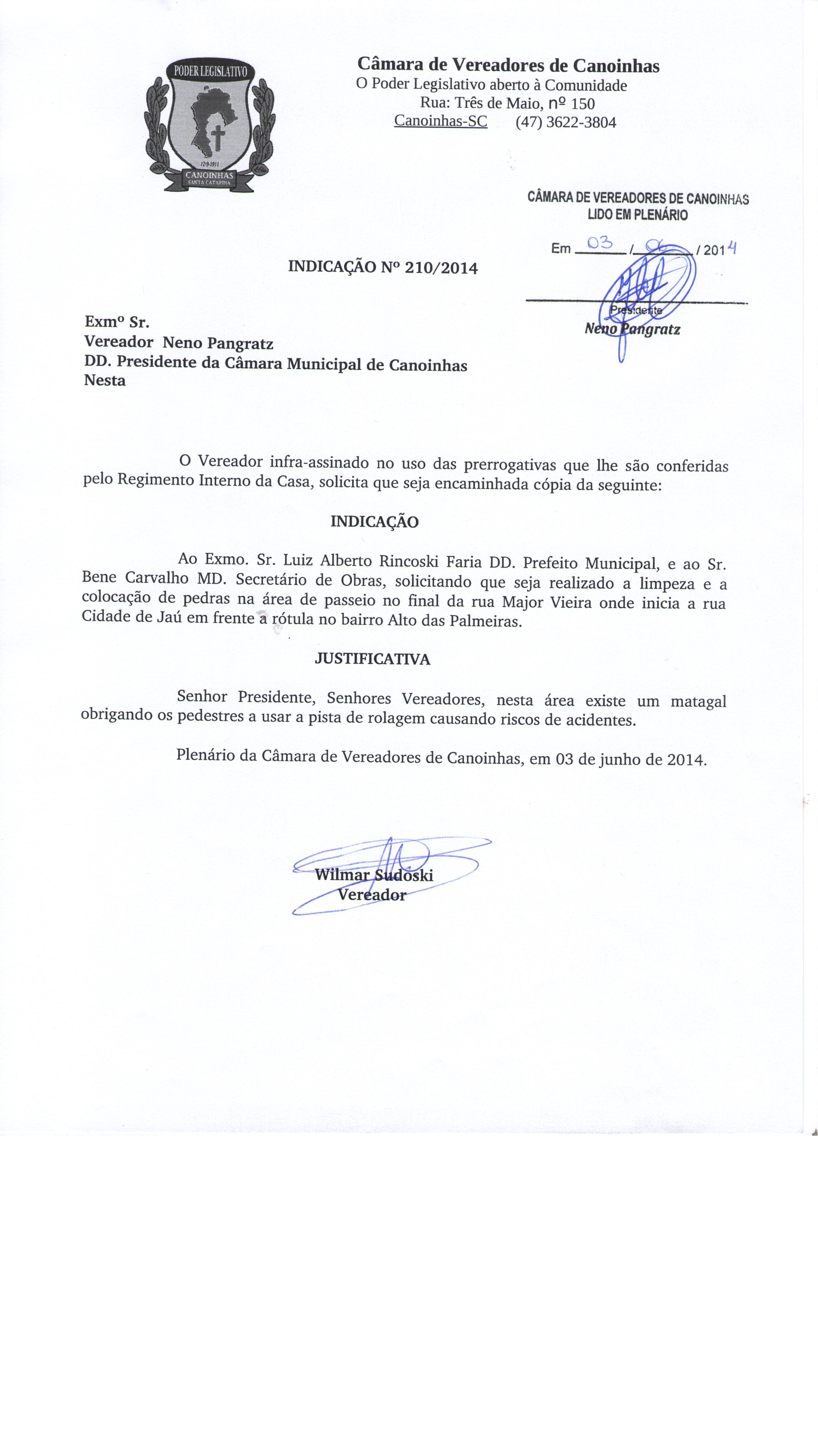 Ementa: INDICAÇÃO Nº 210/2014, DE AUTORIA DO EDIL WILMAR SUDOSKI, AO EXMO. SR. LUIZ ALBERTO RINCOSKI FARIA DD. PREFEITO MUNICIPAL, E AO SR. BENE CARVALHO MD. SECRETÁRIO DE OBRAS, SOLICITANDO VER DA POSSIBILIDADE DE PATROLAR E CASCALHAR A RUA FLÁVIO HAENSCH NO BAIRRO BOA VISTA.