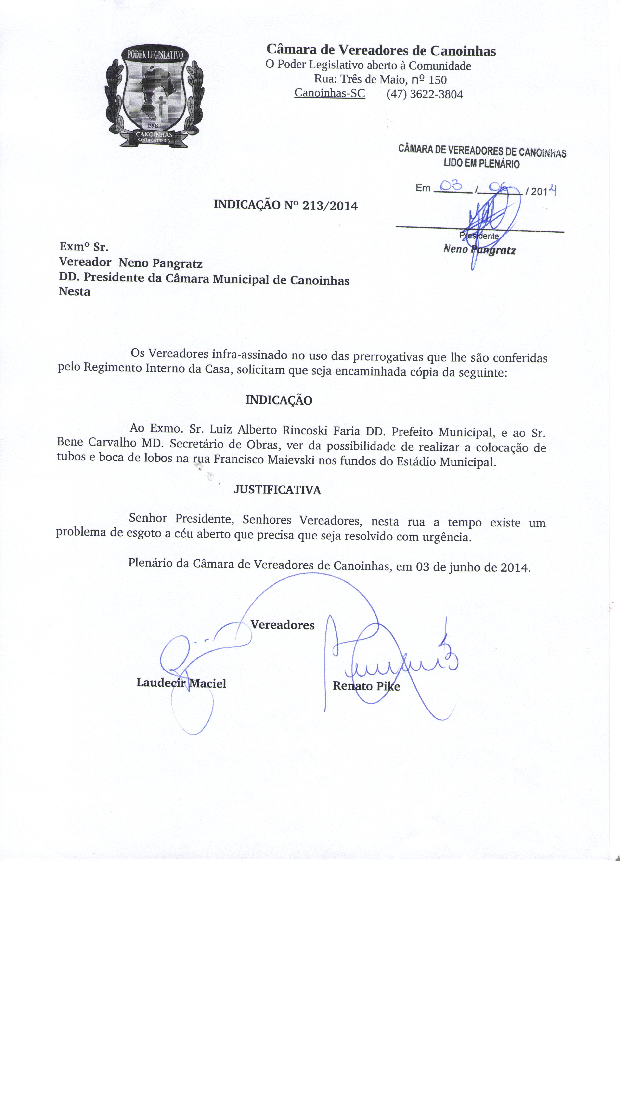 Ementa: INDICAÇÃO Nº 213/2014, DE AUTORIA DO EDIL LAUDECIR MACIEL, AO EXMO. SR. LUIZ ALBERTO RINCOSKI FARIA DD. PREFEITO MUNICIPAL, E AO SR. BENE CARVALHO MD. SECRETÁRIO DE OBRAS, VER DA POSSIBILIDADE DE REALIZAR A COLOCAÇÃO DE TUBOS E BOCA DE LOBOS NA RUA FRANCISCO MAIEVSKI NOS FUNDOS DO ESTÁDIO MUNICIPAL.