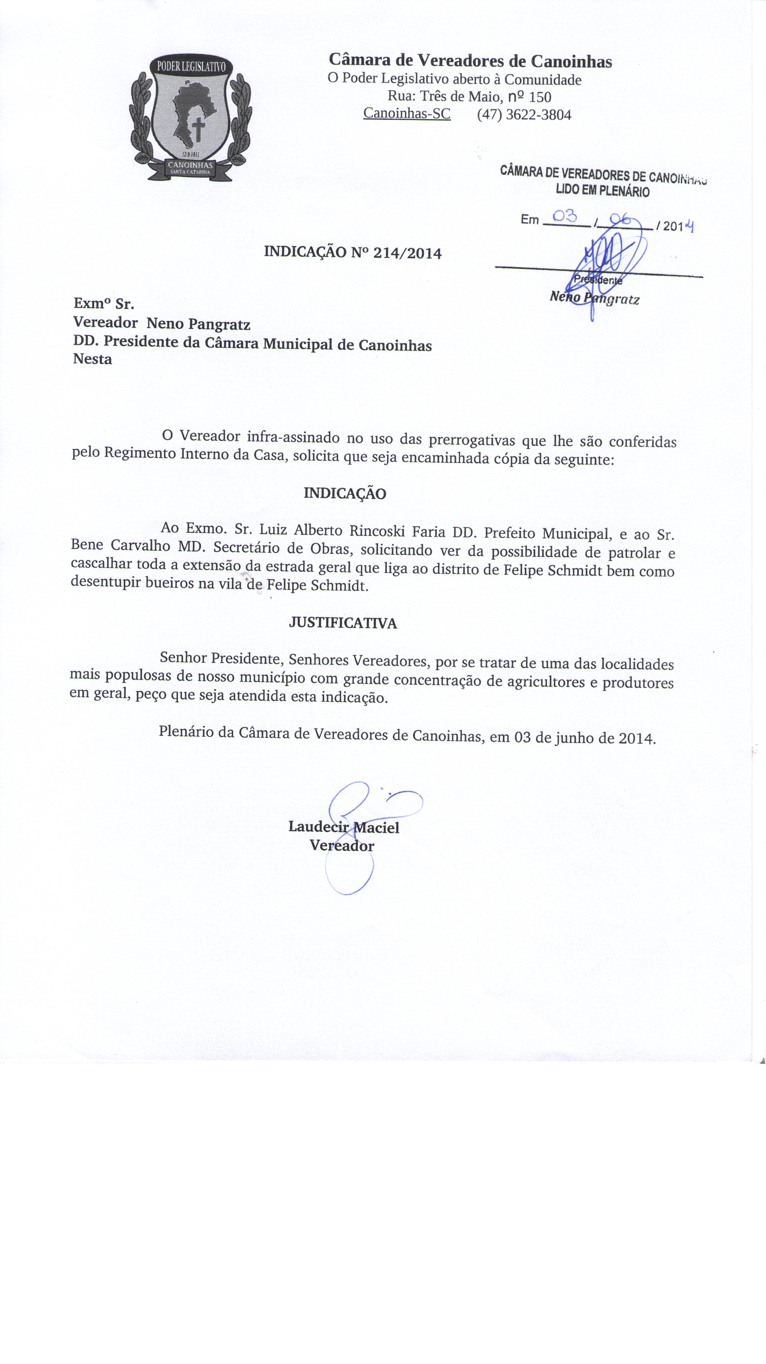 Ementa: INDICAÇÃO Nº 214/2014, DE AUTORIA DO EDIL LAUDECIR MACIEL, AO EXMO. SR. LUIZ ALBERTO RINCOSKI FARIA DD. PREFEITO MUNICIPAL, E AO SR. BENE CARVALHO MD. SECRETÁRIO DE OBRAS, SOLICITANDO VER DA POSSIBILIDADE DE PATROLAR E CASCALHAR TODA A EXTENSÃO DA ESTRADA GERAL QUE LIGA AO DISTRITO DE FELIPE SCHMIDT BEM COMO DESENTUPIR BUEIROS NA VILA DE FELIPE SCHMIDT.