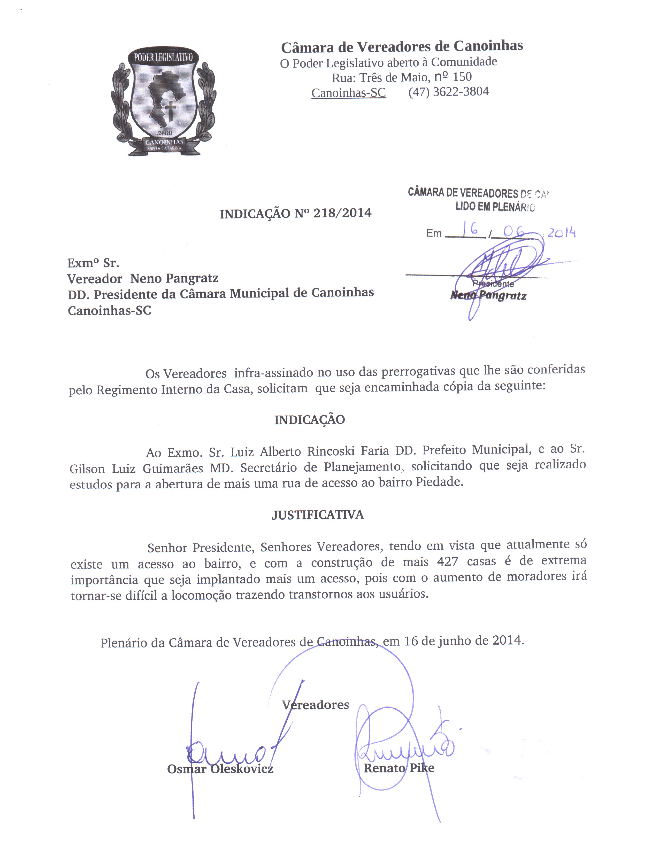 Ementa: INDICAÇÃO Nº 218/2014, DE AUTORIA DO EDIL OSMAR OLESKOVICZ, AO EXMO SR. LUIZ ALBERTO RINCOSKI FARIA DD. PREFEITO MUNICIPAL, E AO SR. GILSON LUIZ GUIMARÃES MD. SECRETÁRIO DE PLANEJAMENTO, SOLICITANDO QUE SEJA REALIZADO ESTUDOS PARA A ABERTIRA DE MAIS UMA RUA DE ACESSO AO BAIRRO PIEDADE.