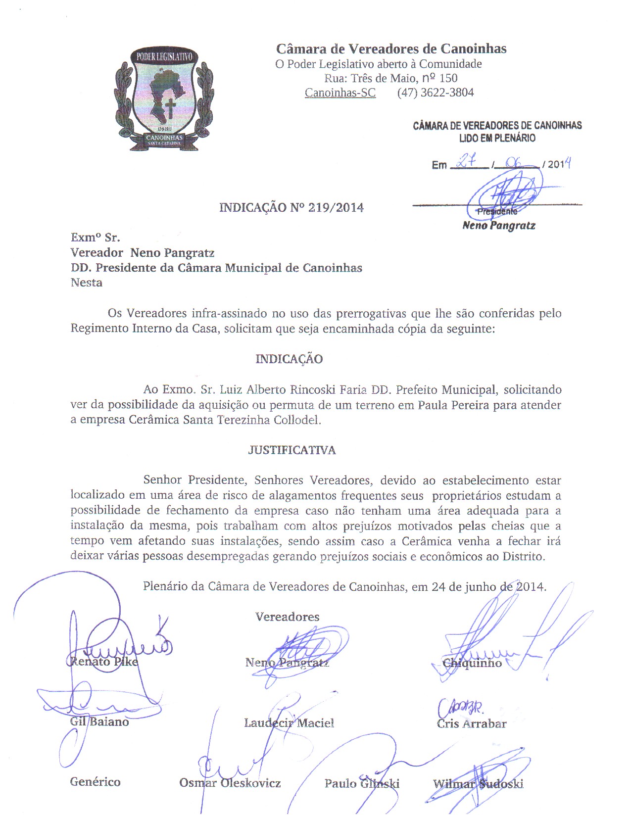 Ementa: INDICAÇÃO Nº 219/2014, DE AUTORIA DO EDIL PAULO GLINSKI, AO EXMO SR. LUIZ ALBERTO RINCOSKI FARIA DD. PREFEITO MUNICIPAL, SOLICITANDO VER DA POSSIBILIDADE DA AQUISIÇÃO OU PERMUTA DE UM TERRENO EM PAULA PEREIRA PARA ATENDER A EMPRESA CERÂMICA SANTA TEREZINHA COLLODEL.
