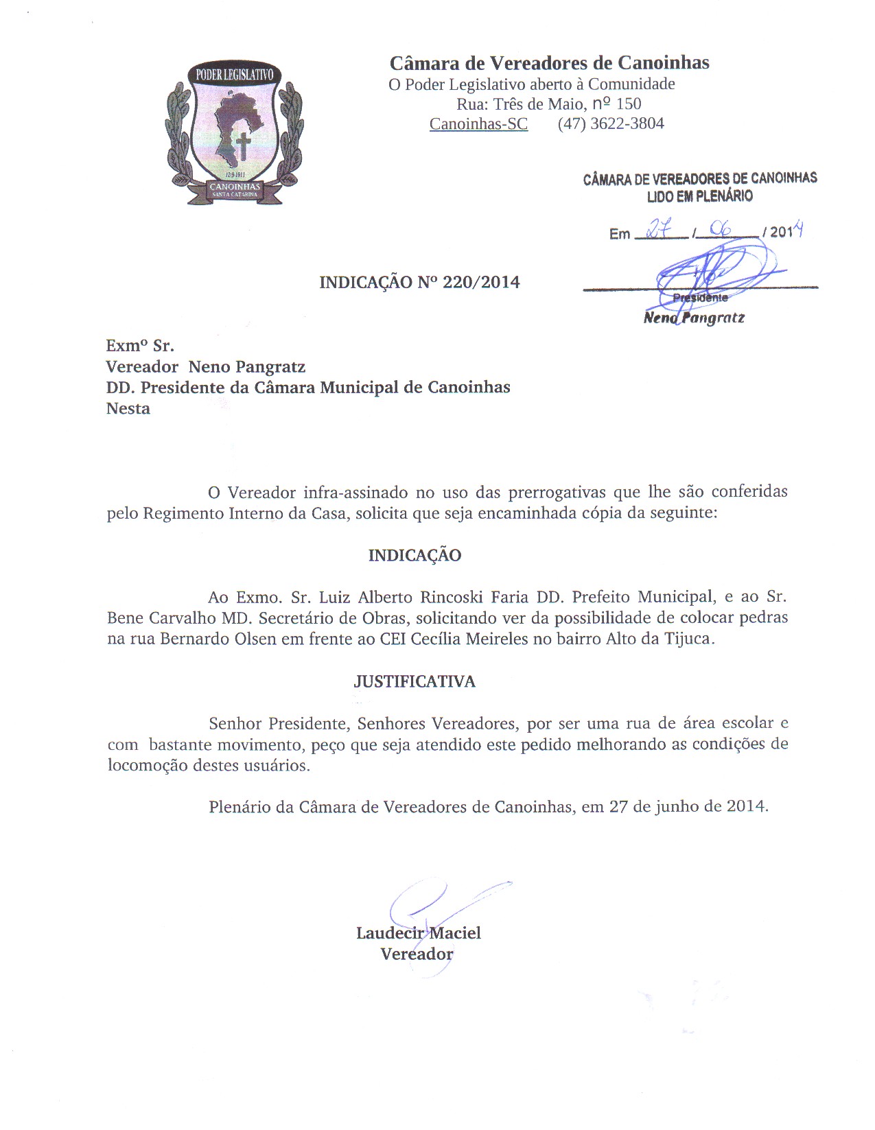 Ementa: INDICAÇÃO Nº 220/2014, DE AUTORIA DO EDIL LAUDECIR MACIEL, AO EXMO SR. LUIZ ALBERTO RINCOSKI FARIA DD. PREFEITO MUNICIPAL, E AO SR. BENE CARVALHO MD. SECRETÁRIO DE OBRAS, SOLICITANDO VER DA POSSIBILIDADE DE COLOCAR PEDRAS NA RUA BERNARDO OLSEN EM FRENTE AO CEI CECÍLIA MAIRELES NO BAIRRO ALTO DA TIJUCA