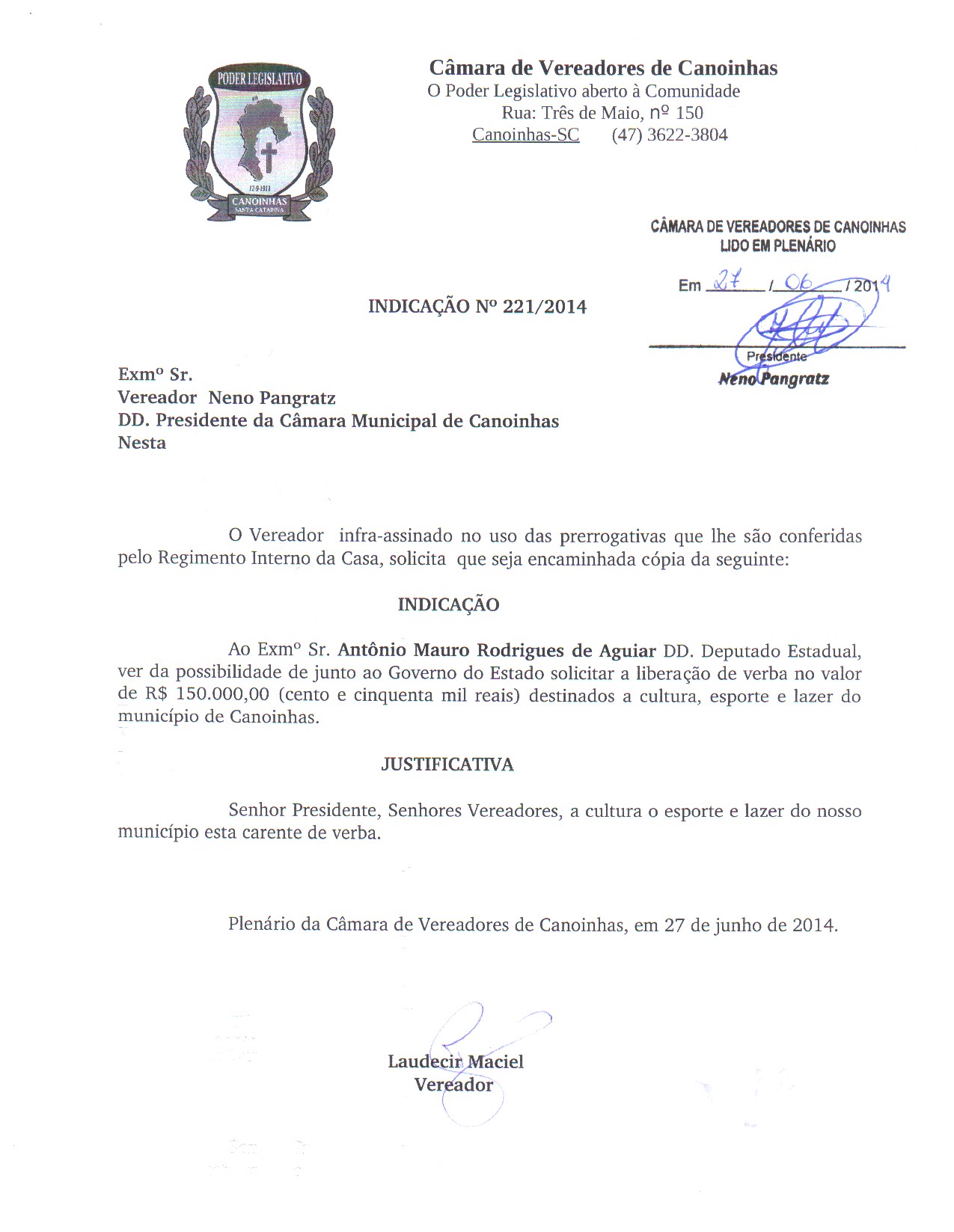 Ementa: INDICAÇÃO Nº 221/2014, DE AUTORIA DO EDIL LAUDECIR MACIEL, AO EXMO SR. ANTÔNIO MAURO AGUIAR DD. DEPUTADO ESTADUAL, VER DA POSSIBILIDADE DE JUNTO AO GOVERNO DO ESTADO SOLICITAR A LIBERAÇÃO DE VERBA NO VALOR DE R$ 150.000,00 (CENTRO E CINQUENTA MIL REAIS) DESTINADOS A CULTURA, ESPORTE E LAZER DO MUNICÍPIO DE CANOINHAS.