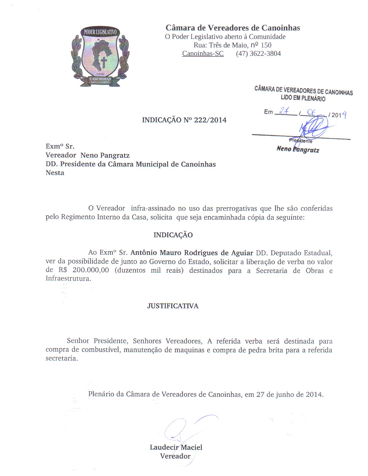 Ementa: INDICAÇÃO Nº 222/2014, DE AUTORIA DO EDIL LAUDECIR MACIEL, AO EXMO SR. ANTÔNIO MAURO RODRIGUES DE AGUIAR DD. DEPUTADO ESTADUAL, VER DA POSSIBILIDADE DE JUNTO AO GOVERNO DO ESTADO, SOLICITAR A LIBERAÇÃO DE VERBA NO VALOR DE R$ 200.000,00 (DUZENTOS MIL REAIS) DESTINADOS PARA A SECRETARIA DE OBRAS E INFRAESTRUTURA.