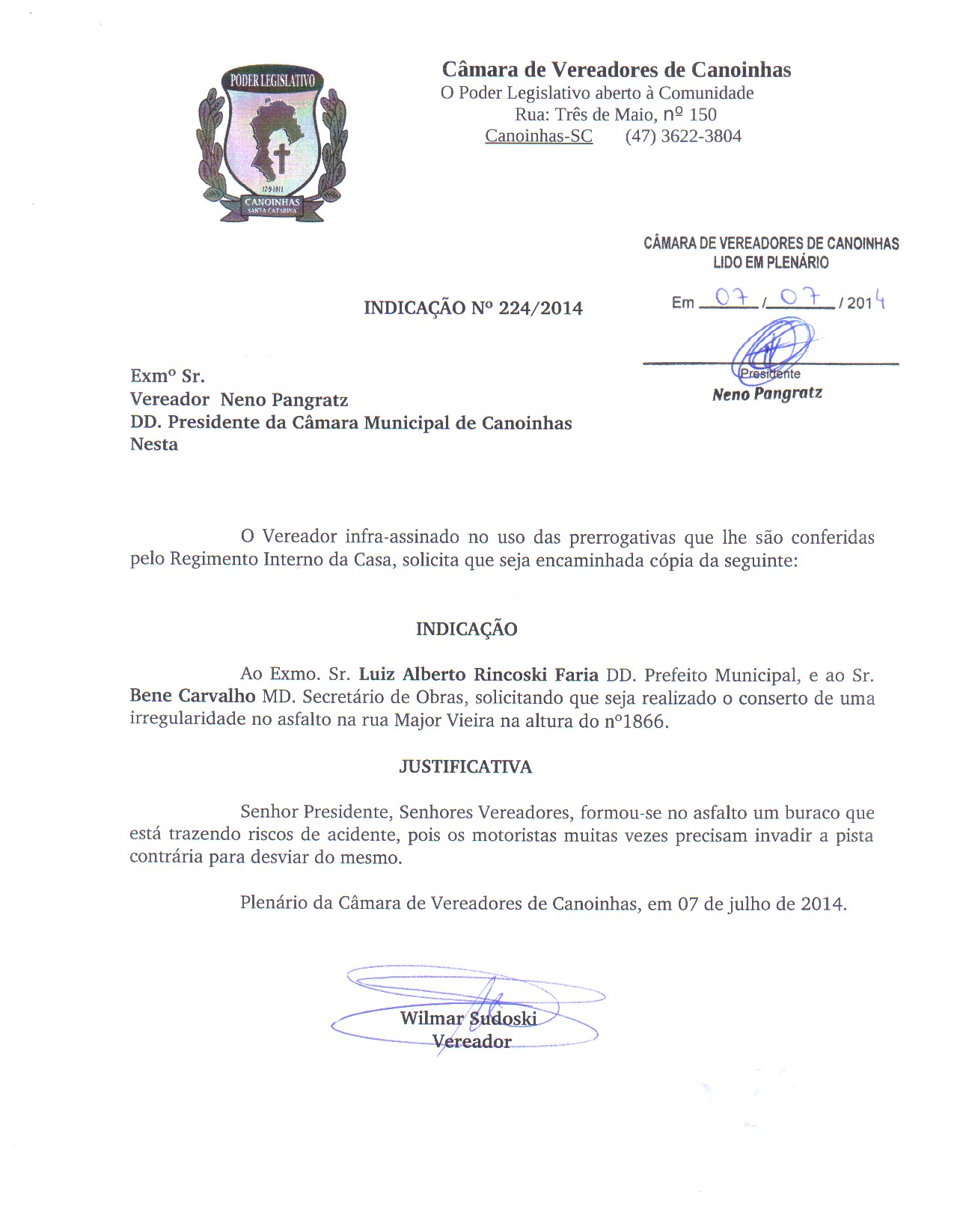 Ementa: INDICAÇÃO Nº 224/2014, DE AUTORIA DO EDIL WILMAR SUDOSKI, AO EXMO SR. LUIZ ALBERTO RINCOSKI FARIA DD. PREFEITO MUNICIPAL, E AO SR. BENE CARVALHO MD. SECRETÁRIO DE OBRAS, SOLICITANDO QUE SEJA REALIZADO O CONSERTO DE UMA IRREGULARIDADE NO ASFALTO NA RUA MAJOR VIEIRA NA ALTURA DO Nº 1866.