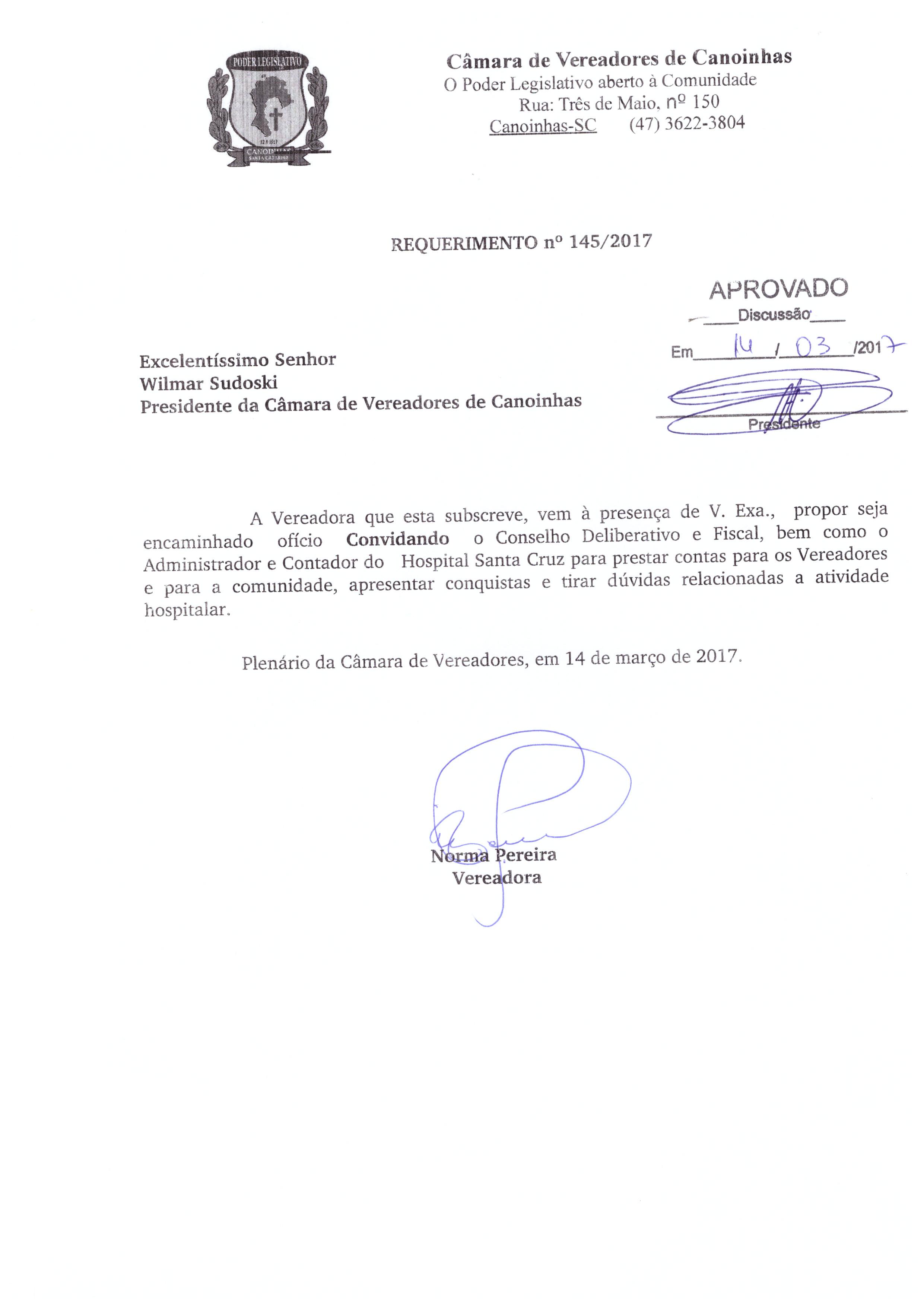 Ementa: REQUERIMENTO Nº145/2017, DE AUTORIA DA EDIL NORMA PEREIRA A VEREADORA QUE ESTA SUBSCREVE, VEM À PRESENÇA DE V. EXA., PROPOR SEJA ENCAMINHADO OFÍCIO CONVIDANDO O CONSELHO DELIBERATIVO E FISCAL, BEM COMO O ADMINISTRADOR E CONTADOR DO HOSPITAL SANTA CRUZ PARA PRESTAR CONTAS PARA OS VEREADORES E PARA A COMUNIDADE, APRESENTAR CONQUISTAS E TIRAR DÚVIDAS RELACIONADAS A ATIVIDADE HOSPITALAR.