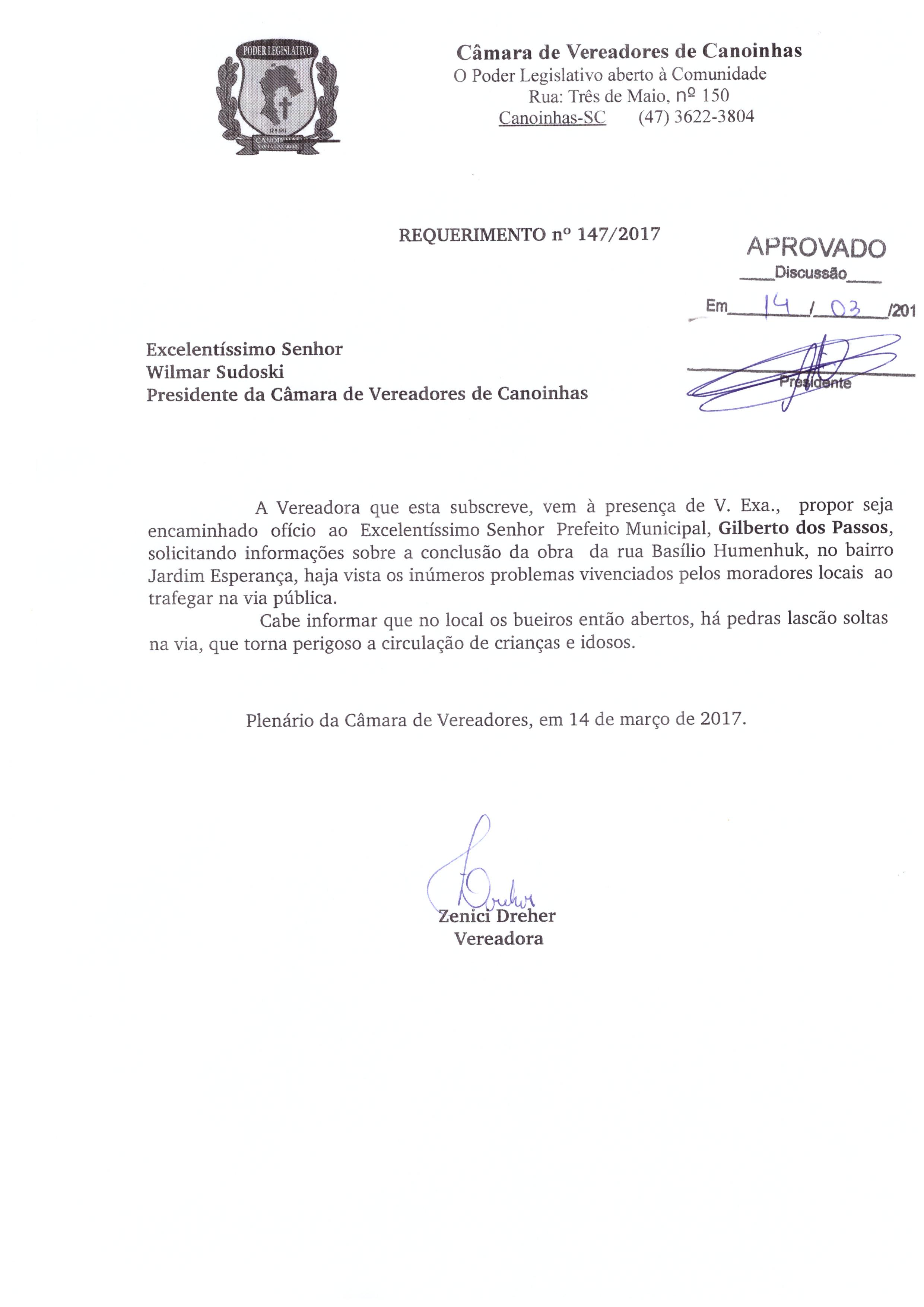 Ementa: REQUERIMENTO Nº147/2017, DE AUTORIA DA EDIL ZENICI DREHERA VEREADORA QUE ESTA SUBSCREVE, VEM À PRESENÇA DE V. EXA., PROPOR SEJA ENCAMINHADO OFÍCIO AO EXCELENTÍSSIMO SENHOR PREFEITO MUNICIPAL, GILBERTO DOS PASSOS, SOLICITANDO INFORMAÇÕES SOBRE A CONCLUSÃO DA OBRA DA RUA BASÍLIO HUMENHUK, NO BAIRRO JARDIM ESPERANÇA, HAJA VISTA OS INÚMEROS PROBLEMAS VIVENCIADOS PELOS MORADORES LOCAIS AO TRAFEGAR NA VIA PÚBLICA.