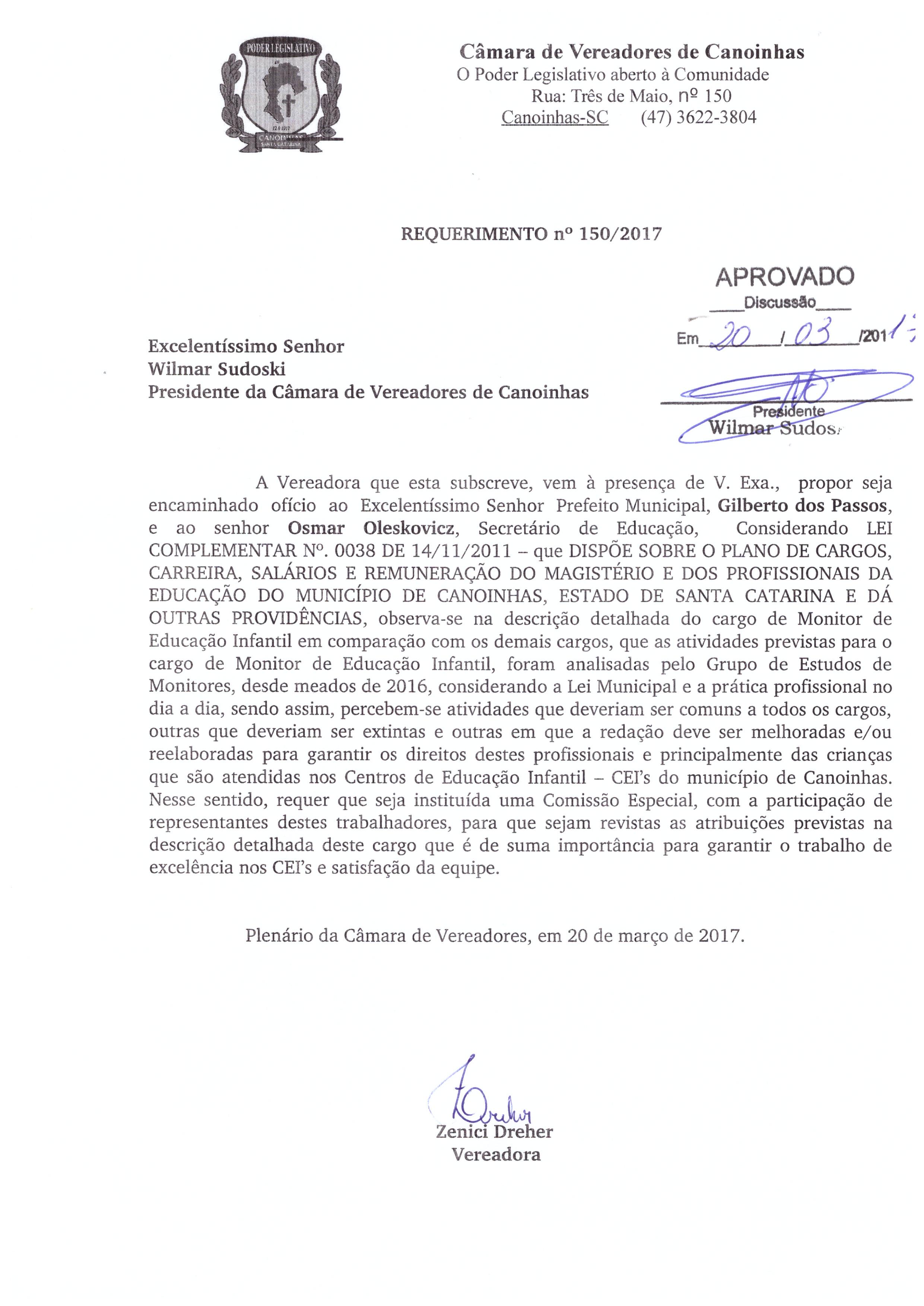 Ementa: REQUERIMENTO Nº150/2017, DE AUTORIA DA EDIL ZENICI DREHER
