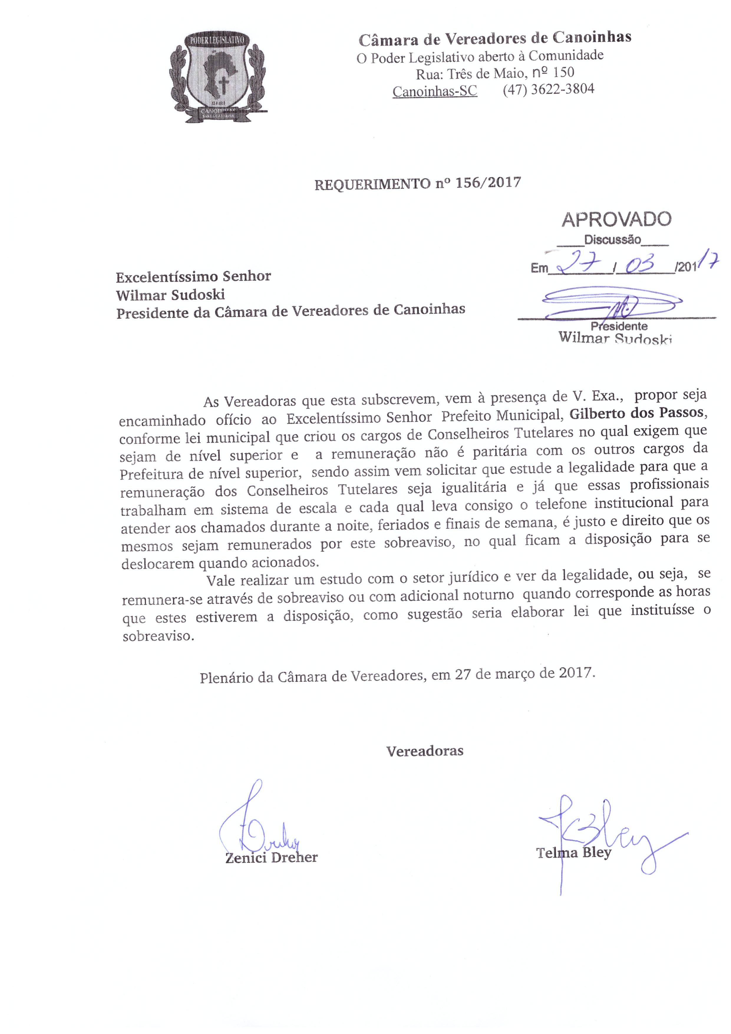 Ementa: REQUERIMENTO Nº156/2017, DE AUTORIA DA EDIL ZENICI DREHER E TELMA BLEY