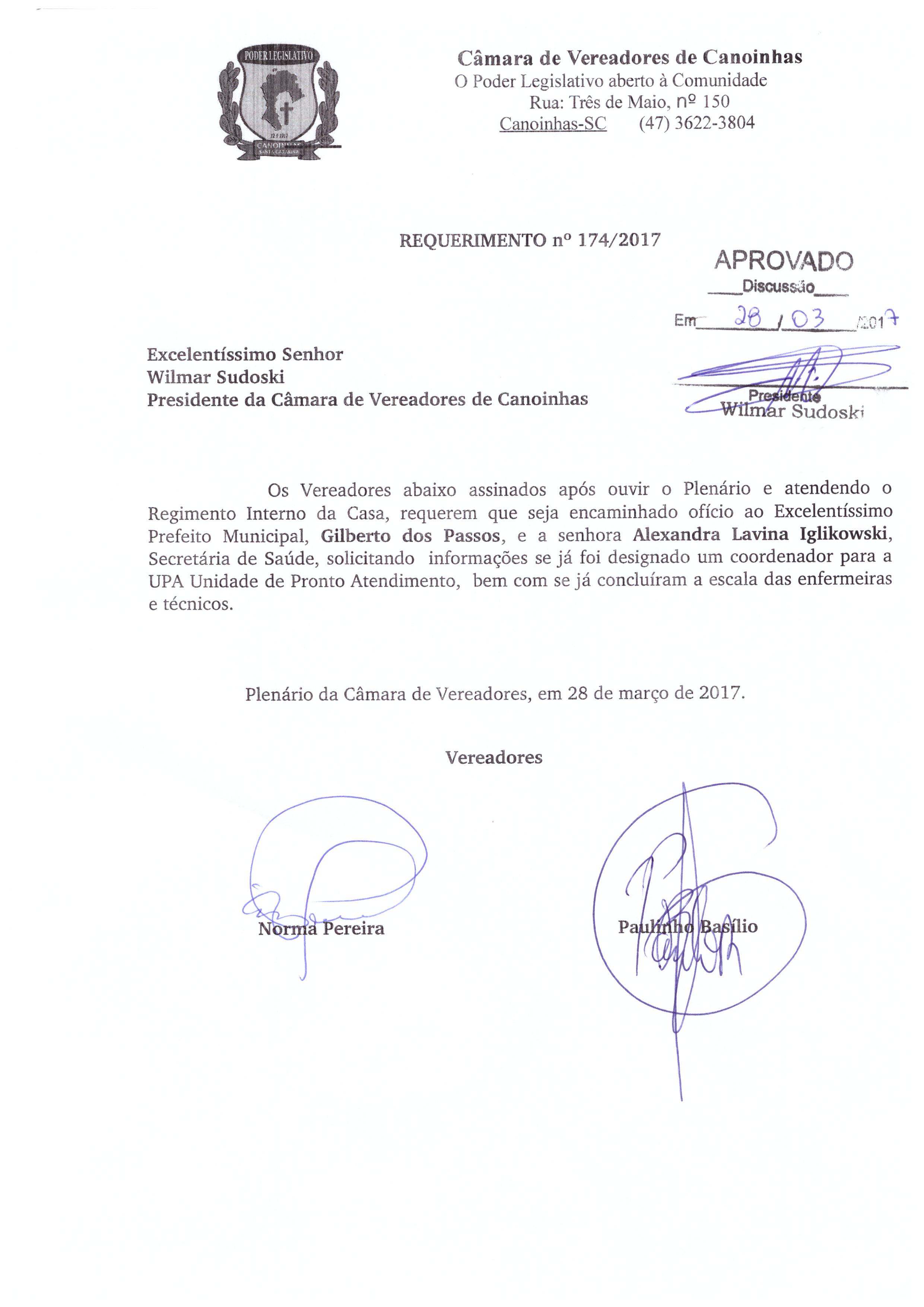 Ementa: REQUERIMENTO Nº174/2017, DE AUTORIA DA EDIL NORMA PEREIRA OS VEREADORES ABAIXO ASSINADOS APÓS OUVIR O PLENÁRIO E ATENDENDO O REGIMENTO INTERNO DA CASA, REQUEREM QUE SEJA ENCAMINHADO OFÍCIO AO EXCELENTÍSSIMO PREFEITO MUNICIPAL, GILBERTO DOS PASSOS, E A SENHORA ALEXANDRA LAVINA IGLIKOWSKI, SECRETÁRIA DE SAÚDE, SOLICITANDO INFORMAÇÕES SE JÁ FOI DESIGNADO UM COORDENADOR PARA A UPA UNIDADE DE PRONTO ATENDIMENTO, BEM COM SE JÁ CONCLUÍRAM A ESCALA DAS ENFERMEIRAS E TÉCNICOS.